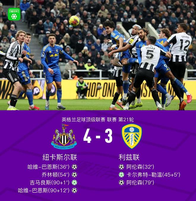 北京时间1月8日英格兰足球顶级联赛 联赛 第21轮,纽卡斯尔联主场对阵利兹联。上半场,阿伦森破门打破场上平衡。随后,巴恩斯破门扳平比分。补时尾声,勒温主罚点球命中将比分超出。下半场,乔林顿破门扳平比分。比赛末段,阿伦森低射破门再次超出比分完成梅开二度。补时阶段,阿伦森手球送点,吉马良斯一蹴而就扳平比分。补时读秒阶段,巴恩斯禁区内转身抽射破门完成梅开二度,彻底将比赛杀死。最终,纽卡4-3逆转利兹联全取三分。