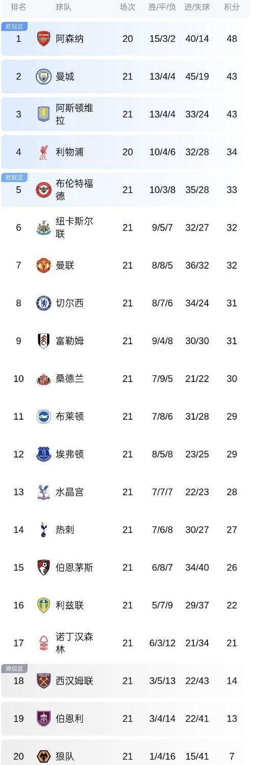 北京时间1月8日,英超联赛第21轮结束多场比赛的争夺,几支豪门球队相继翻车丢分,对于阿森纳来说极为有利,枪手有望扩大领先优势,剑指英超冠军。英超一夜5场冷门!曼城3连平,曼联+切尔西换帅白搭,积分榜大乱。