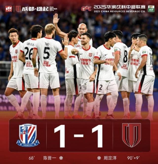 最后一场绝平是刚刚结束的申花vs蓉城的焦点之战,周定洋第99分钟补射破门,帮助蓉城1-1读秒绝平申花,并且占据了争冠的绝对优势。