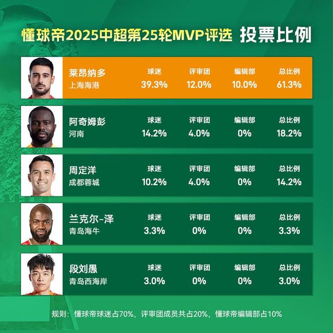 大家好,欢迎来到懂球帝2025赛季中超MVP评选现场。中超第25轮MVP得主出炉,上海海港外援莱昂纳多凭借争冠关键战中的帽子戏法,毫无悬念地当选本轮中超的MVP。这是莱昂纳多历史第3次获得中超MVP,他的前两次MVP均来自2023年,有趣的是他每次拿到中超MVP时,效力的球队都不一样。