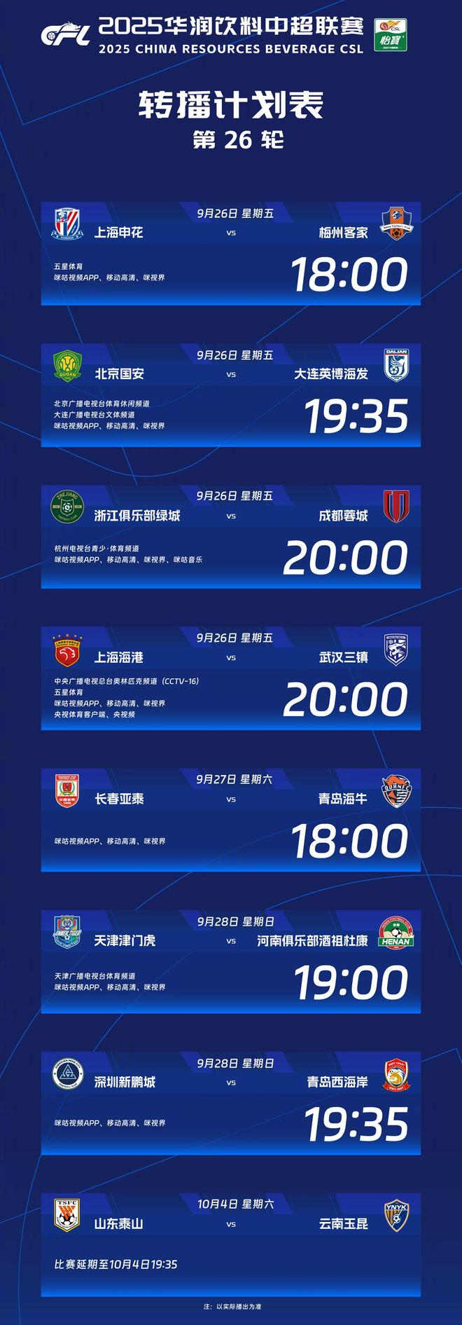 9月26日至28日,2025赛季中超联赛第26轮将展开7场角逐(山东泰山与云南玉昆的比赛延期至10月4日19:35进行)。赛前,中超官方发布了转播计划表。根据转播计划,本轮先进行的7场比赛中,都有网络平台直播,5场还有电视平台直播。