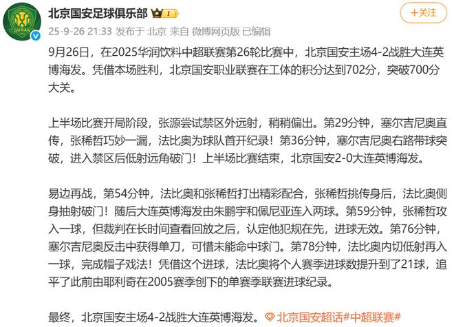 新京报讯 据北京国安足球俱乐部官博消息,9月26日,在2025华润饮料中超联赛第26轮比赛中,北京国安主场4-2战胜大连英博海发。凭借本场胜利,北京国安职业联赛在工体的积分达到702分,突破700分大关。