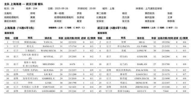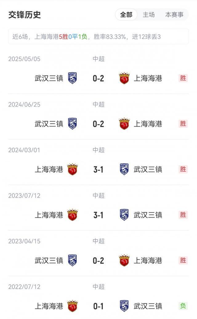 上海海港16胜6平3负积54分,排名中超第2;武汉三镇6胜6平13负积24分,排名中超第12。