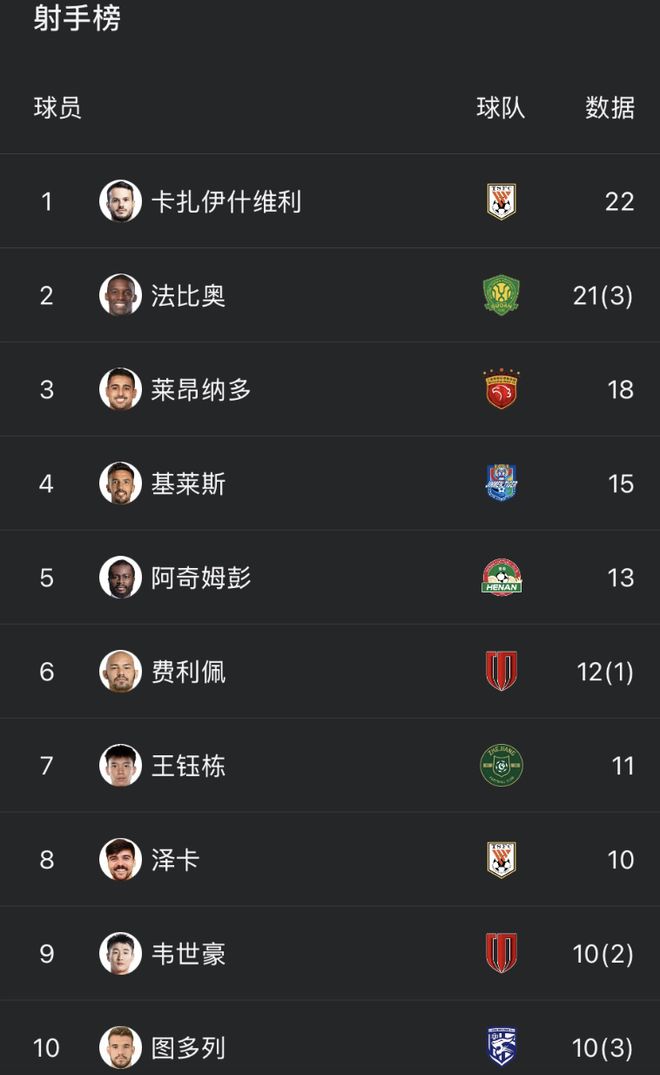 雷速体育9月26日讯 今晚中超第26轮先赛4场,本轮对阵英博上演帽子戏法的国安前锋法比奥,已经在射手榜上逼近了榜首的泰山外援卡扎伊什维利,目前双方的差距缩小至1球。海港外援莱昂纳多面对三镇打入两球后,以两球优势领先津门虎外援基莱斯,独居射手榜第三位。