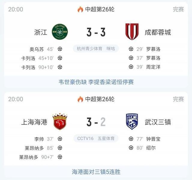 而在20:00同时开球的两场争冠球队的比赛中,上海海港在1-2落后的情况下连追两球,并且由莱昂纳多完成读秒绝杀武汉三镇;而成都在40分钟3-0领先的情况下,被浙江队连追3球扳平比分,外援亚戈完成绝平,这让成都蓉城白白丢掉了2分。本轮开始前,成都与海港同积54分,而在两场比赛结束后,海港57分反超55分的成都登上榜首。