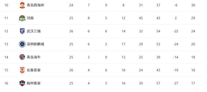 2队已经提前上岸!分别是积30分的青岛西海岸队,积29分的河南队。因为联赛只剩下最后4轮,即便是亚泰队剩余的比赛全部赢球,积分最多也就30分。
