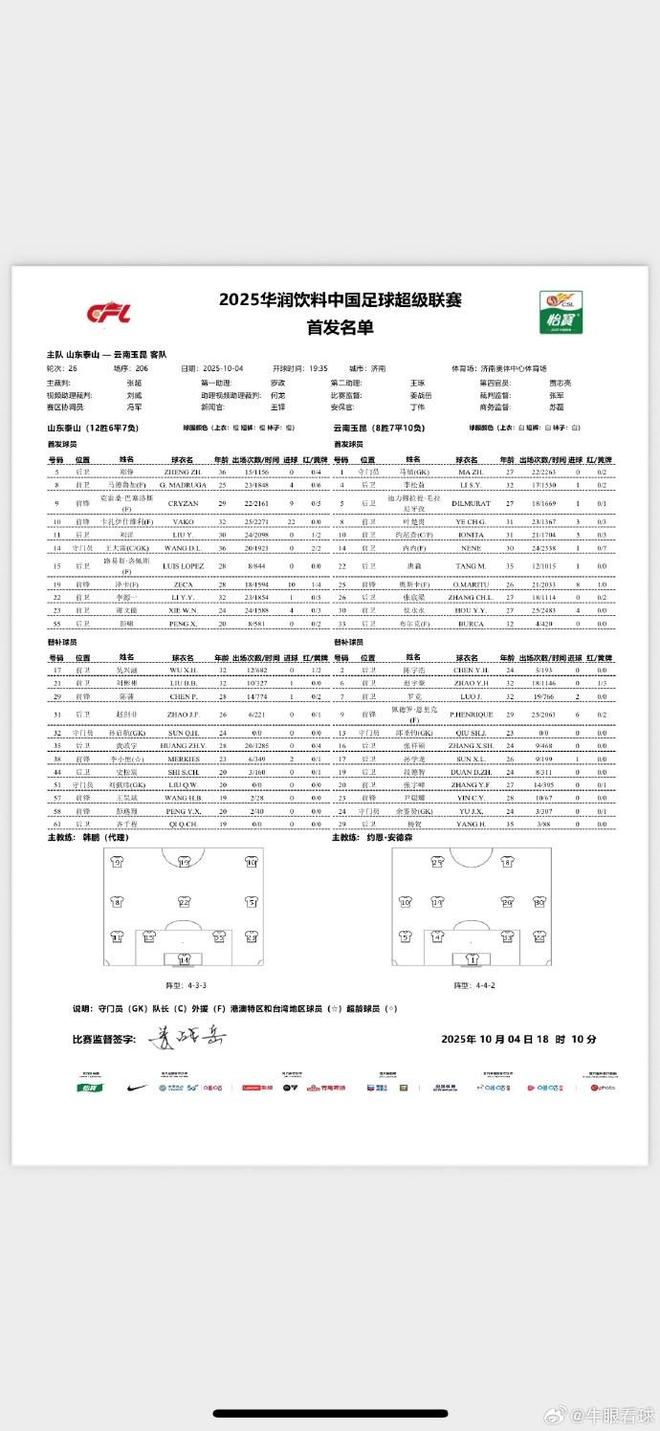 北京时间10月4日19:35,中超第26轮,山东泰山主场迎战云南玉昆,赛前双方公布了本场比赛的首发阵容: