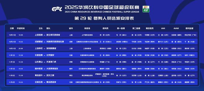 另外两支争冠球队,成都蓉城主场与河南队的比赛由艾堃执哨,VAR是戴弋戈;上海申花主场与深圳新鹏城的比赛由麦麦提江执哨,VAR为黄翼。