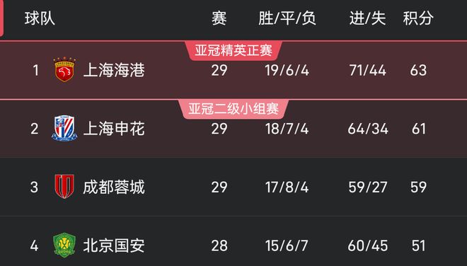 在联赛仅剩1轮的情况下,积分榜前三分别为:上海海港(63分),上海申花(61分),成都蓉城(59分)。目前成都蓉城已经退出争冠争夺,上海双雄将末轮决出本赛季联赛冠军的最终归属。