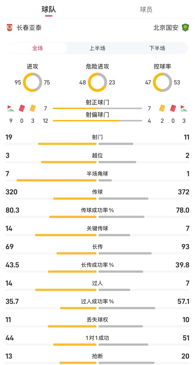 雷速体育11月1日讯 今天下午结束的中超第29轮的一场比赛中,长春亚泰主场0-4不敌北京国安,此战没能拿分,长春亚泰保级形势不容乐观。尽管长春亚泰本场比赛进攻十分积极,但效率不够高,也没能取得进球。北京国安方面,法比奥梅开二度,张玉宁和塞尔吉尼奥分别进球。