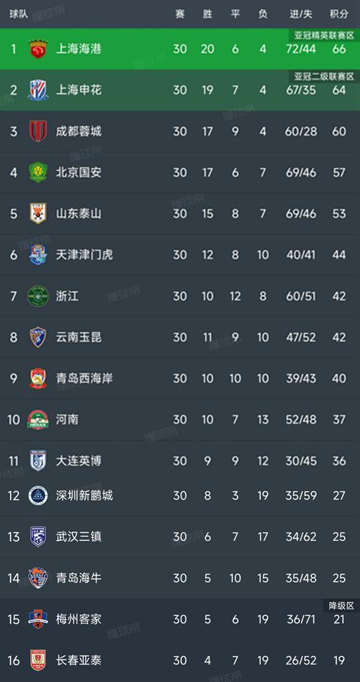 中超最新积分榜