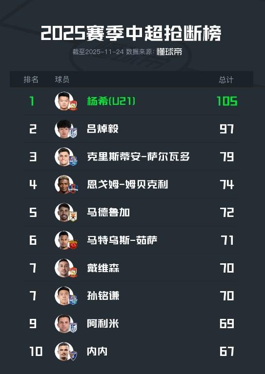 11月22日,2025赛季中超联赛落下战幕。根据懂球帝统计的2025赛季中超球员抢断榜:青岛西海岸队杨希以105次排名第一,大连英博队吕焯毅和天津津门虎队萨尔瓦多分列二、三位。
