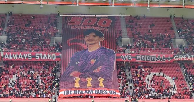 TIFO上是球队主力门将颜骏凌的形象,有数字“500”,是为了纪念颜骏凌代表海港在各项正式比赛里出战500场。